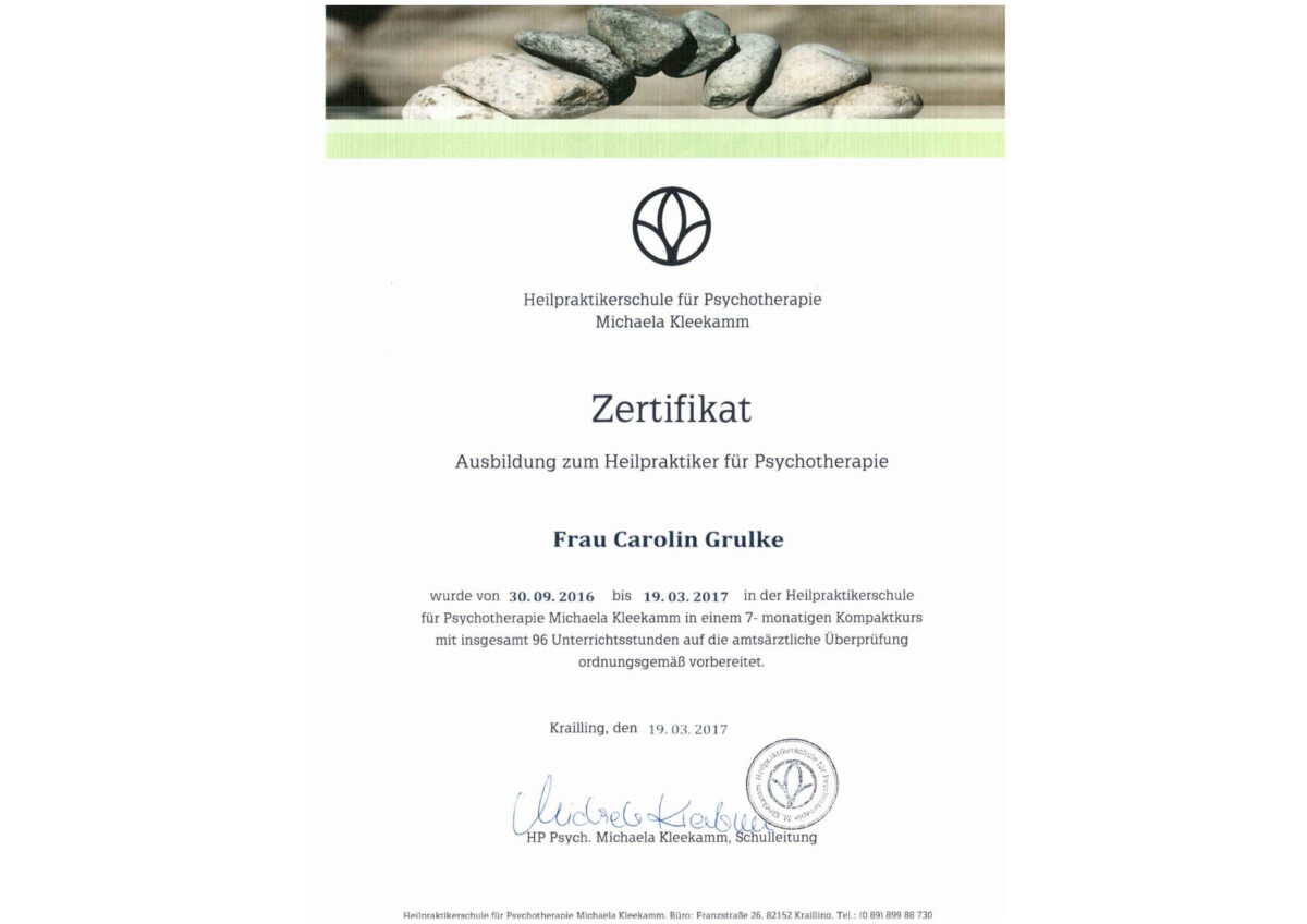 2016 – 2017 Ausbildung zur Heilpraktikerin für Psychotherapie Heilpraktikerschule Michaela Kleekam